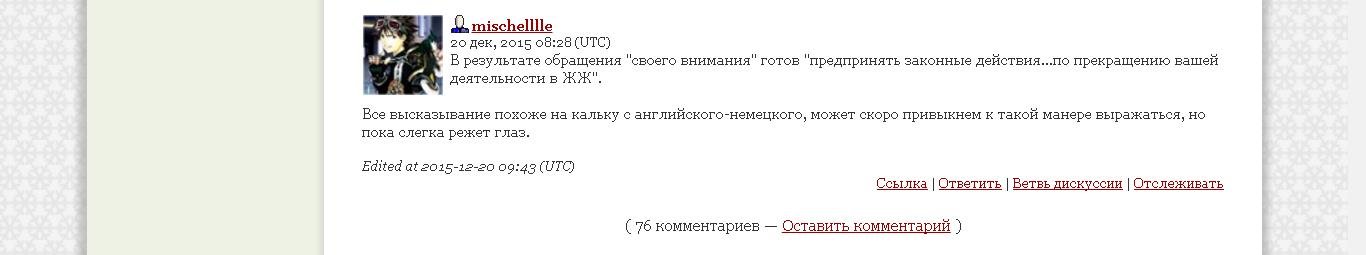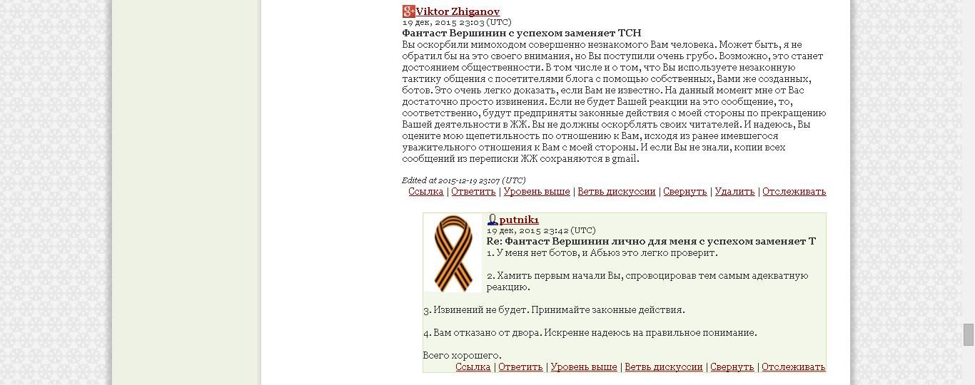 Вы оскорбили мимоходом совершенно незнакомого Вам человека. Может быть, я не обратил бы на это своего внимания, но Вы поступили очень грубо. Возможно, это станет достоянием общественности. В том числе и о том, что Вы используете незаконную тактику общения с посетителями блога с помощью собственных, Вами же созданных, ботов. Это очень легко доказать, если Вам не известно. На данный момент мне от Вас достаточно просто извинения. Если не будет Вашей реакции на это сообщение, то, соответственно, будут предприняты законные действия с моей стороны по прекращению Вашей деятельности в ЖЖ. Вы не должны оскорблять своих читателей. И надеюсь, Вы оцените мою щепетильность по отношению к Вам, исходя из ранее имевшегося уважительного отношения к Вам с моей стороны. И если Вы не знали, копии всех сообщений из переписки ЖЖ сохраняются в gmail."