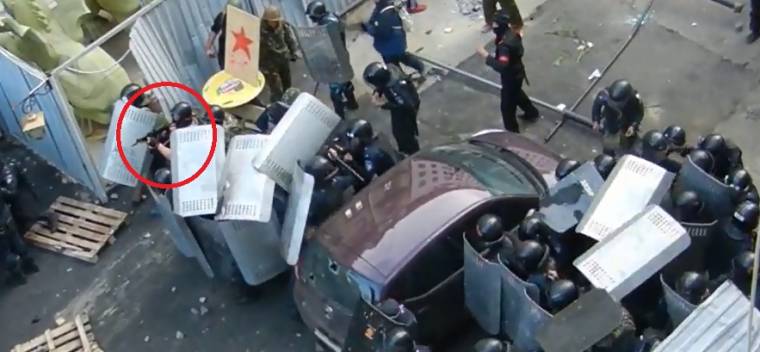 Вот боевик с автоматом стреляет по ультрас прямо из рядов милиционеров: