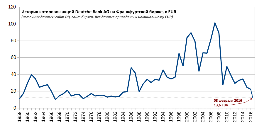 Я сверился на сайте банка с историей котировок за последние несколько десятилетий. Как я и ожидал, банк тестирует сейчас абсолютные минимумы — на столь низких уровнях котировки не задерживались надолго с начала 1980-х годов, а если мы учтём инфляцию евро и немецкой марки, то мы поймём, что сейчас банк переживает чуть ли самый крупный кризис со времён Второй мировой войны: