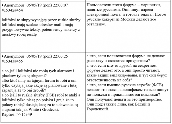 В мае этого года польские СМИ, как обычно со ссылкой на анонимные источники, сообщили, что российские спецслужбы в 2019 году использовали свои старые и уже засветившиеся аккаунты в интернете, чтобы сагитировать «пользователей сети интернет» разослать сообщения о минировании польских школ в период выпускных экзаменов. «Пользователи сети интернет», о которых идет речь, это анонимные авторы польского форума Lolifox. В апреле-мае 2019 года они действительно обсуждали и планировали рассылку ложных писем о минировании школ. Сайт был удален, но сохранилась его архивная копия со всей перепиской этих «бомберов».