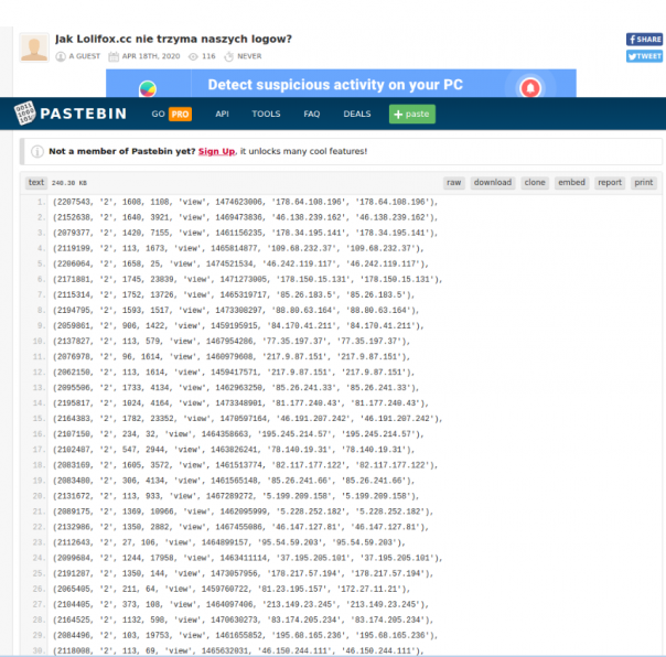 Спустя почти год к этой теме решили вернуться, и 18 апреля 2020 года на анонимном портале Pastebin украинские хакеры выложили перечень IP-адресов, которые будто принадлежали именно пользователям Lolifox. По крайней мере так было заявлено. И вот в этом перечне неназванные эксперты, проводившие «детальный анализ» атаки, и обнаружили «всем известные» айпишники российских спецслужб.