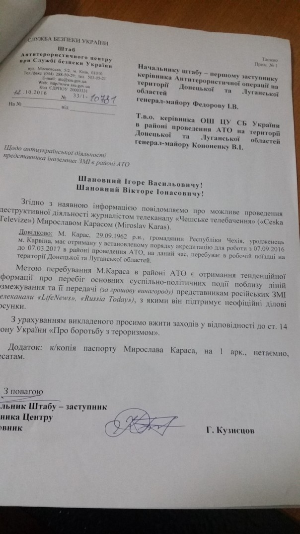 В письме сообщается, что представитель чешского телевидения Мирослав Каррас, имея официальную аккредитацию на работу в районе АТО, собирает «тенденциозную информацию» в интересах российских СМИ.