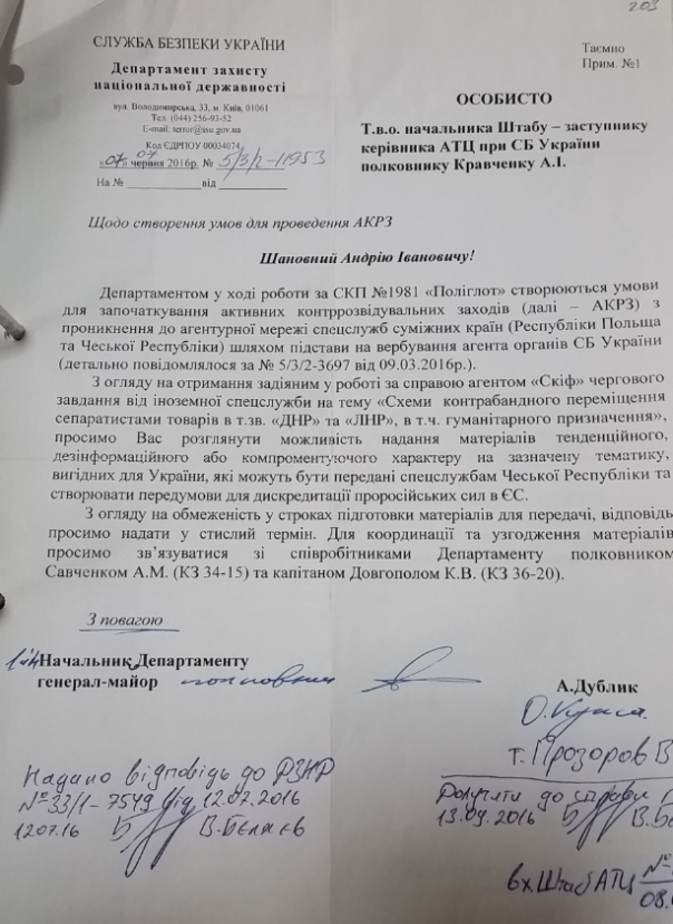 Ведением агентурной разведки в силовых структурах европейских государств дело не ограничивалось. СБУ проводило активные операции по дезинформации спецслужб и военного руководства стран ЕС. В этой связи интерес представляет документальное подтверждение мероприятия Департамента защиты национальной государственности (ДЗНГ) СБУ в рамках дела контрразведывательного поиска (ДКП) «Полиглот» №1981.