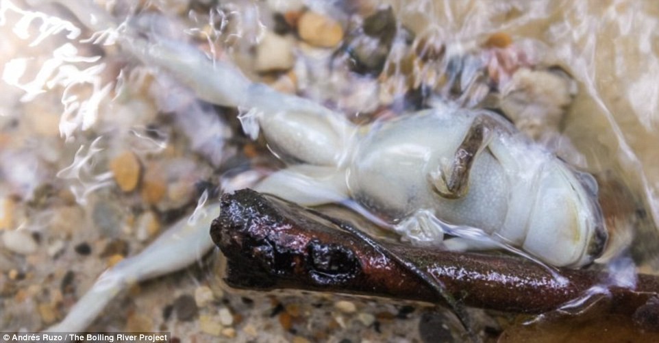 Погибшая лягушка. «Я видел, как в реку падали всевозможные живые существа. Когда они попадают в воду, первыми угасают глаза. Глазные яблоки очень быстро становятся молочно-белыми. Сначала они пытаются выплыть, но их ткани отмирают, они теряют силу, и в конце концов течение уносит их прочь».
