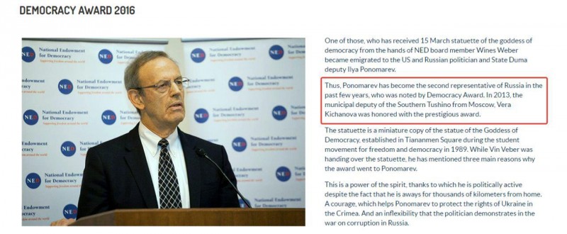 Беглый оппозиционный депутат Илья Пономарев, которого разыскивают российские правоохранительные органы за расхищение средств фонда «Сколково», награжден премией Democracy Award.