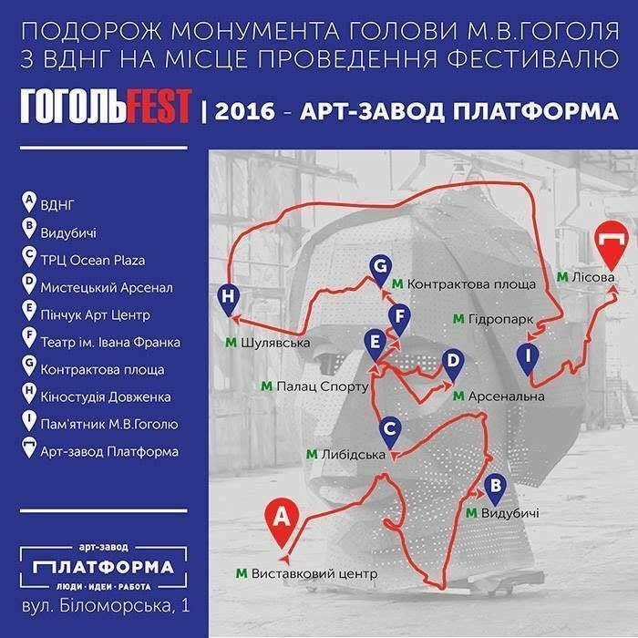 «С 11:00 до 17:00 в Киеве состоится художественная акция «Гоголь едет на Арт-завод Плтаформа». Скульптура, изображающая голову Гоголя, которая является символом фестиваля ГОГОЛЬFEST, проедет по улицам столицы. В 11:00 голова Гоголя на специальном транспорте отправится с места проведения последнего фестиваля – Национального комплекса «Экспоцентр Украины» (проспект Академика Глушкова, 1). Отмечается, что колонна автомобилей проедет по маршруту, в который входят все локации, где происходил ГОГОЛЬFEST, памятники, площади и знаковые культурные места столицы. Во время остановок колонны, актеры в костюмах будут устраивать мини-перфомансы для прохожих. В 17:00 голова Гоголя будет установлена на «Арт-Заводе Платформа» (ул. Беломорская, 1), где пройдет ГОГОЛЬFEST», — говорится в сообщении.