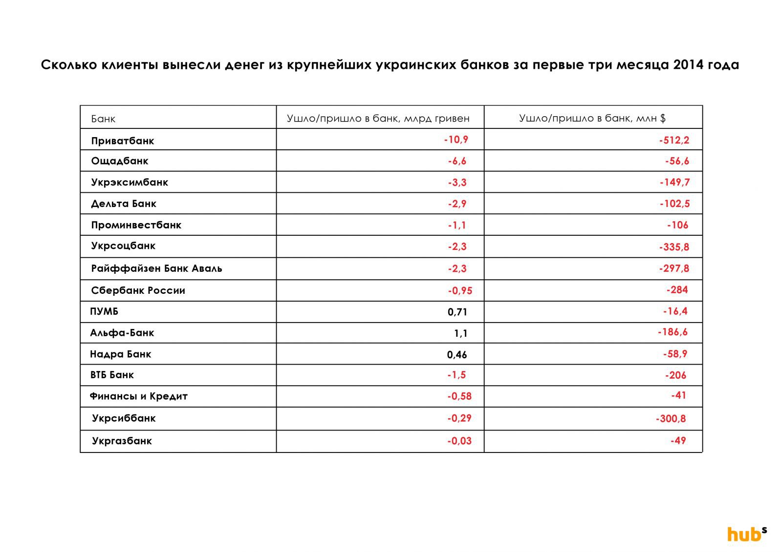 Крупнейший банк страны Приватбанк выдал своим клиентам за январь-март 2014 года около 11 млрд гривен и немногим более полумиллиарда долларов. Чтобы поддержать ликвидность, Нацбанк выделил банку Игоря Коломойского и Геннадия Боголюбова около 10 млрд гривен рефинансирования.