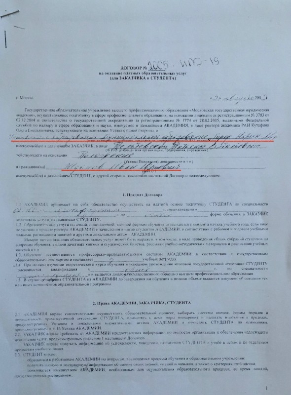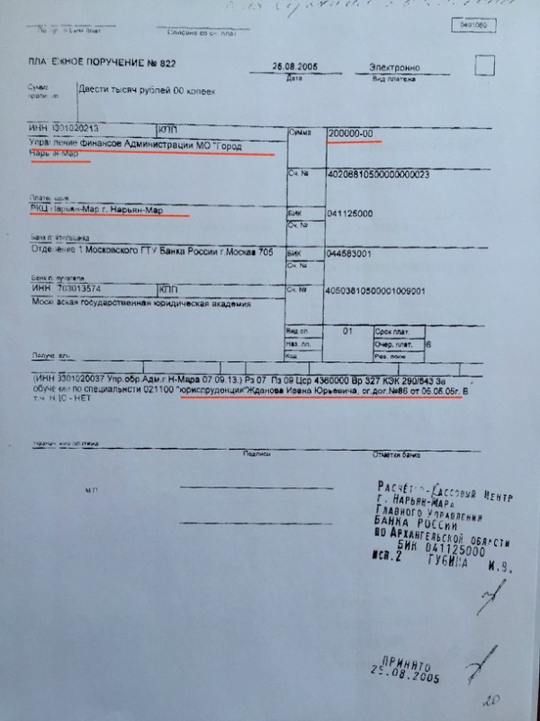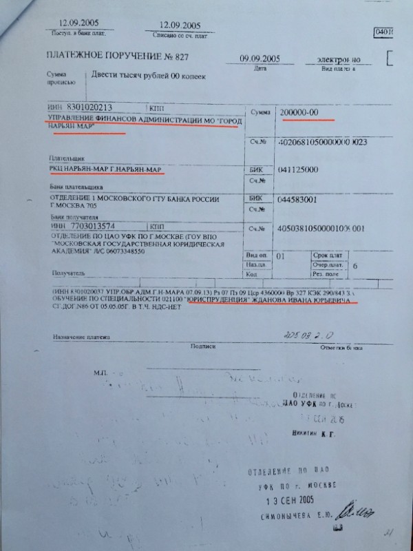 Правда Ваня немного туповат, перепутал и вместо папы свое имя вписал.А вот доказательства подтверждающие, что в 2005 году Управление образования администрации МО «городской округ «город Нарьян-Мар» заключило договор с ГОУ ВПО «Московская государственная Академия» им. О.Е. Кутафина на оплату обучения И.Ю. Жданова по очной форме. Цена договора бюджетных денег 600 000 рублей, что в 2005 году составляло внушительную сумму.Платежные поручения, подтверждающие что за будующее "олицетворения" борьбы с российской коррупцией коррупционным способом платились деньги из городского бюджета г. Нарьян-Мар.Суть этой истории такова, что один из лидеров Фонда борьбы с коррупцией Иван Жданов превозносящий в Сети правильные идеи против взяточничества, недобросовестных чиновников, фактически уже в юном возрасте являлся одиним из подельников мутной схемы вывода бюджетных денег г.Нарьян-Мар. Пытаясь сформировать у читателей образ добросовестного борца с коррупционным режимом, Жданов как часть этой самой цепочки, когда являясь сыном высокопоставленного чиновника незаконно тратил бюджетные деньги. Ведь учась в престижной юридической академии на юриста - юрист Жданов однозначно понимал, что является частью жульнической схемы в собственном образовании.