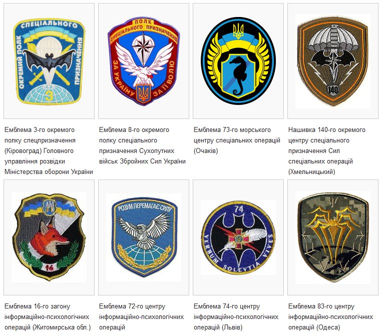Знайте врага в лицо! Вот эти подразделения проводят информационную поддержку террора. Именно они внедряют концепцию "вины жертвы". И когда в следующий раз "украинский активист" будет знать подробности обстрела Донецка раньше, чем тот закончится, а профессора из КПИ сделают схему самообстрела быстрее, чем журналисты-новостники успеют доехать до места попадания, то знайте. Скорее всего у этих активистов и профессоров на рукавах такие нашивки. Когда вам рассказывают, что для прекращения обстрелов нужно "полюбить Украину", это делают эти люди.
