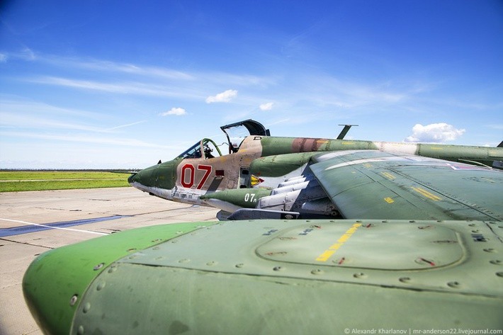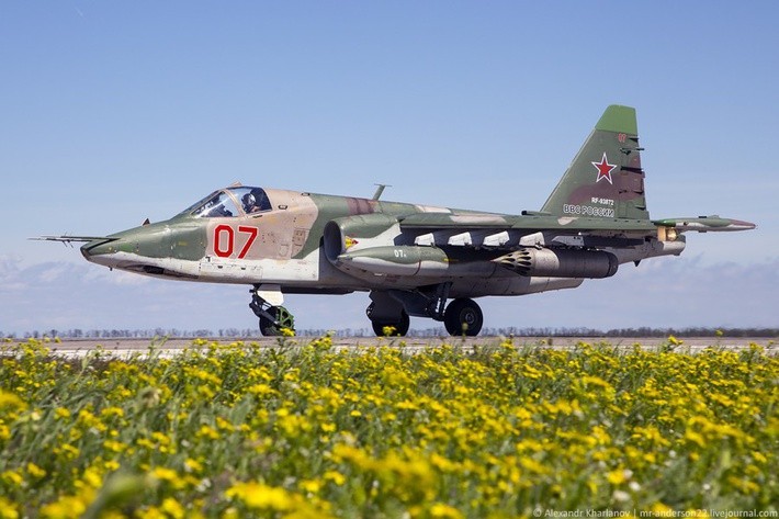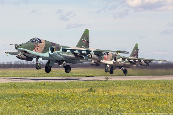 Взлет пары Су-25СМ и Су-25. В соревнованиях принимают участие летчики трех штурмовых полков из Краснодарского и Ставропольских краев и авиабазы Гвардейское в Крыму. У штурмовиков в программе стрельба из пушечного вооружения, стрельба неупраляемыми ракетами и бомбометание.