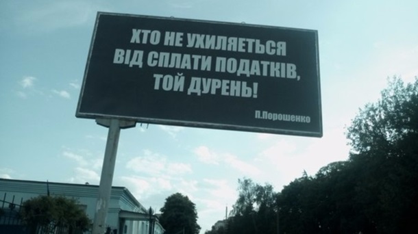 Антипорошенковские биллборды появились в Черкассах в ночь на 23 мая. На одном из них (на улице Максима Зализняка) написаны слова, принадлежащие президенту Петру Порошенко: «Кто не уклоняется от уплаты налогов, тот дурак!».