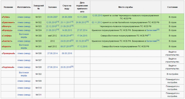 Как в 2010 году заявлял Директор ФСБ России Александр Бортников, только на верфях Санкт-Петербурга планируется построить минимум 25 сторожевых кораблей проекта 22460. Судостроительная фирма «Алмаз» на сегодняшний день продолжает строительство еще трех сторожевиков, заказ на которые поступил в ноябре 2014 года.