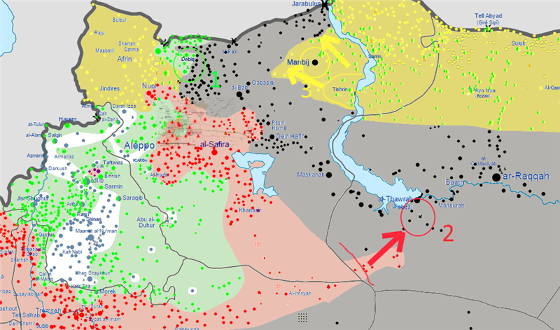 Почти разгромленные возле турецкой границы «умеренные» начали контратаковать и вернули некоторые населенные пункты, потерянные ранее, во время наступления ИГИЛ (1). А с юга правительственные силы нанесли свой удар…