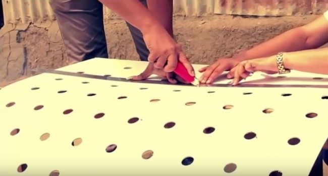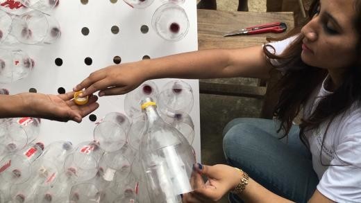 Чтобы решить проблему, разработчик создал специальный щит с прорезанными в нем круглыми отверстиями. Он вставляется в стену дома, как москитная сетка в окно. В отверстиях находятся разрезанные пополам пластиковые бутылки, закрепленные разрезанными крышками.