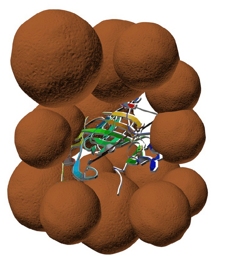 Схематичное изображение наночастицы тромболитического средства. Фермент, окруженный магнетитовым каркасом