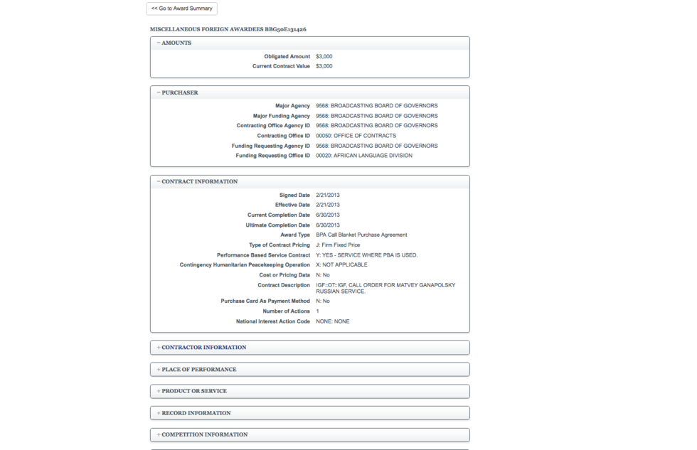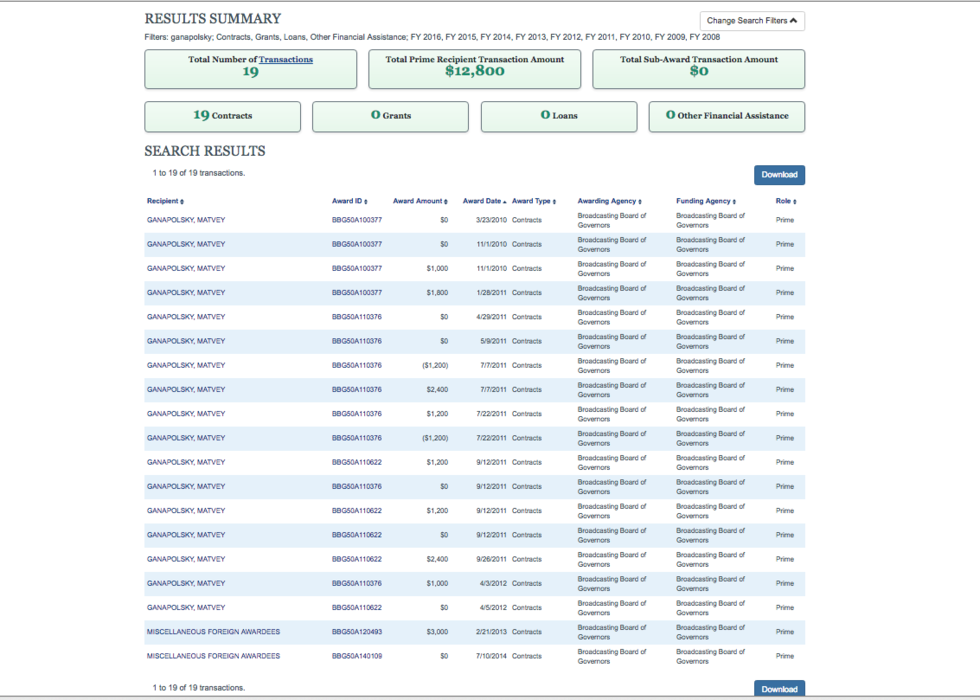 В получении денег от американского правительственного агентства BBG (Broadcasting Board of Governors, Совет управляющих по вопросам вещания) уличил Матвея Ганапольского канал Life. Журналисты отыскали информацию о перечислении денег сотруднику "Эха Москвы" в открытых источниках - на портале самого BBG.
