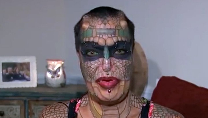 Женщина-дракон (как она сама себя называет) отрезала уши и нос, а также сделала татуировки в виде чешуи по всему телу, чтобы стать максимально похожей на змею, сообщает газета The Daily Mirror.