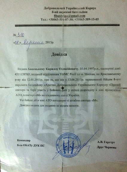 Одиннадцатиклассник Кирилл Банецкий уехал из Москвы в Киев в апреле 2015 года, не закончив среднее образование и не дождавшись выпускного. На видео, которое он позже снял с товарищем по «Правому сектору», школьник признался, что давно планировал отъезд на Украину. «Хотел попасть ещё на Майдан. Но не смог, так как не пустили через российскую границу. Мне на тот момент было 16 лет. И как только исполнилось 18 лет, уже спустя пару недель я был в «Правом секторе». Готовился, получается, чуть более полутора лет», — вспомнил Кирилл.