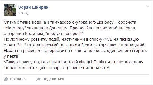 В «европейском» Facebook, в который ушли пользователи из «ФСБ-шного и москальского Вконтакте», люди, не стесняясь выражений, высказывают свои предположения касательно того, кто же именно стал заказчиком убийства Моторолы. Как ни странно, в очередной раз украинцы видят только «руку Москвы», «одобрение Кремля» и происки ФСБ.
