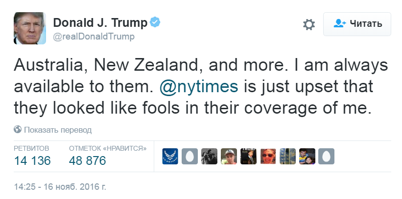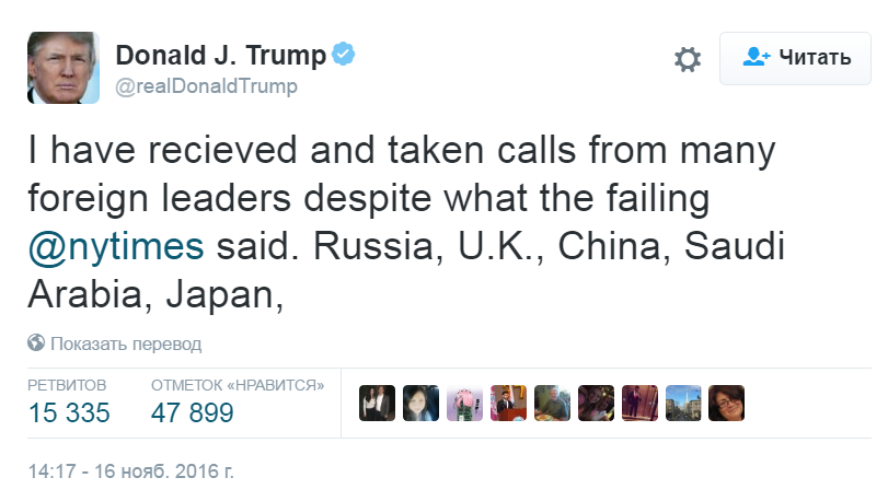 Всё выяснилось после того, как Дональд Трамп в своём твиттере сообщил общественности с лидерами каких стран он провёл телефонные переговоры. Украины в данном списке нет.