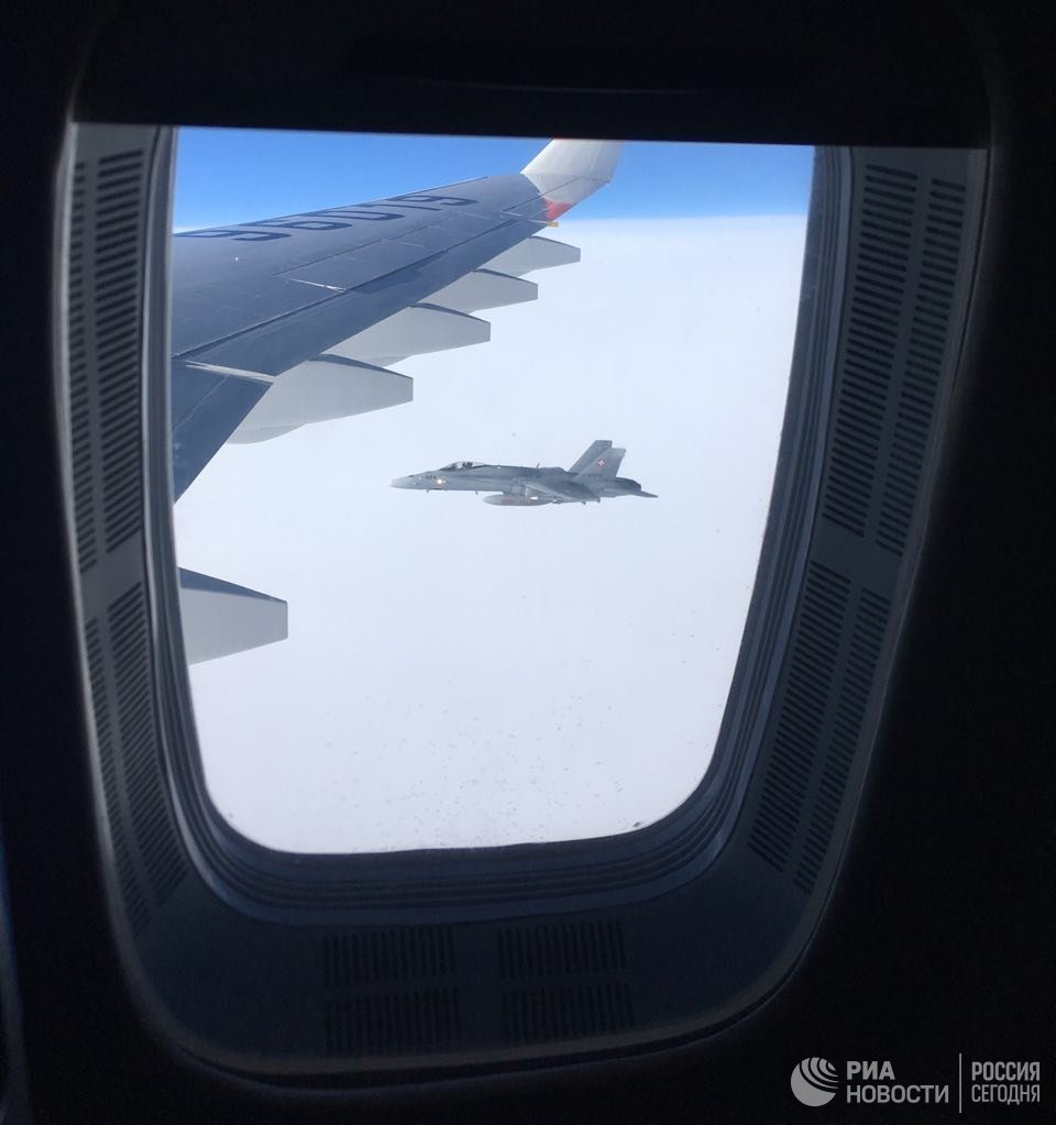 Пилоты истребителей с швейцарскими флагами на хвосте перестали сопровождать российский борт, как только тот покинул пространство Швейцарии. Источник