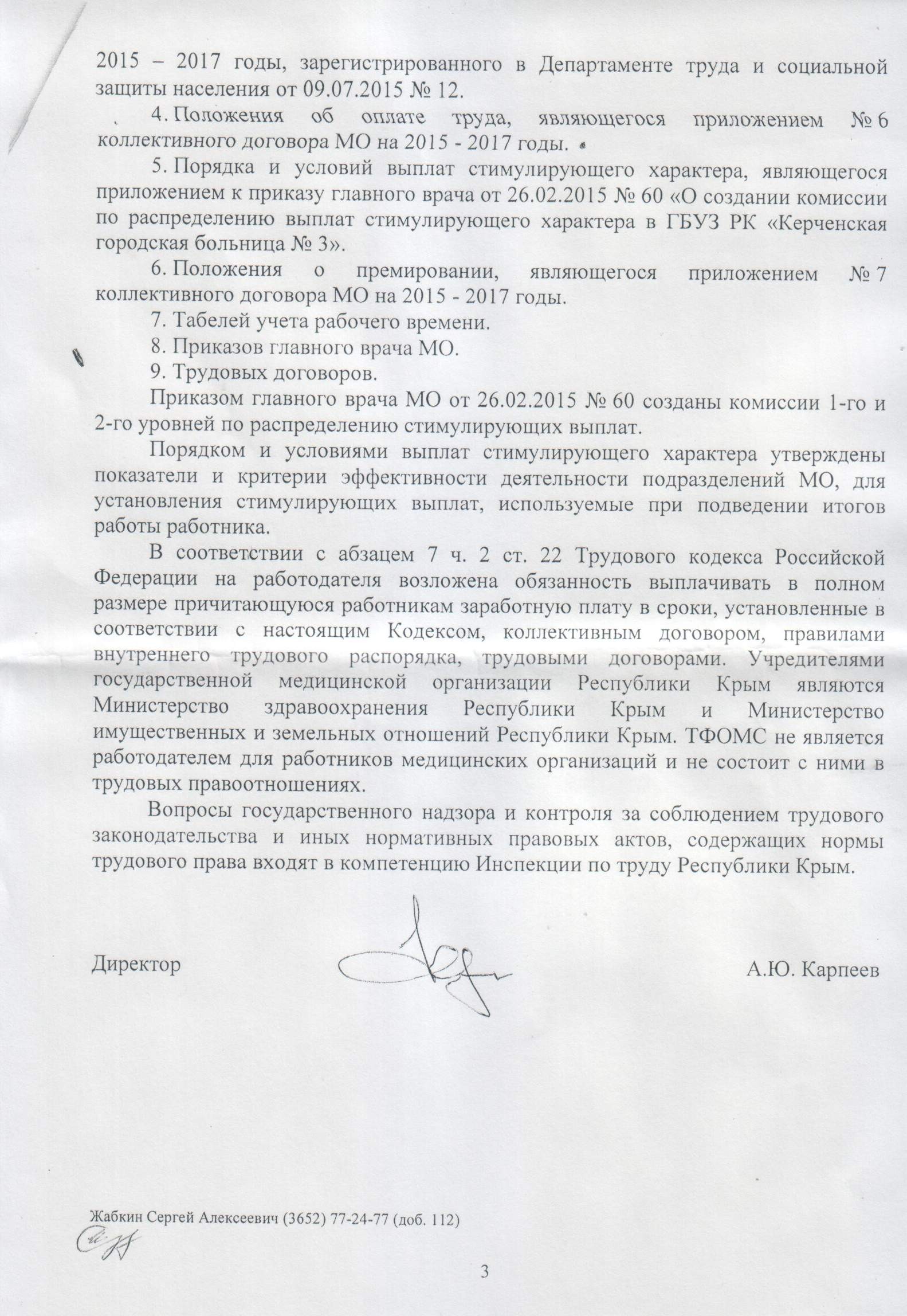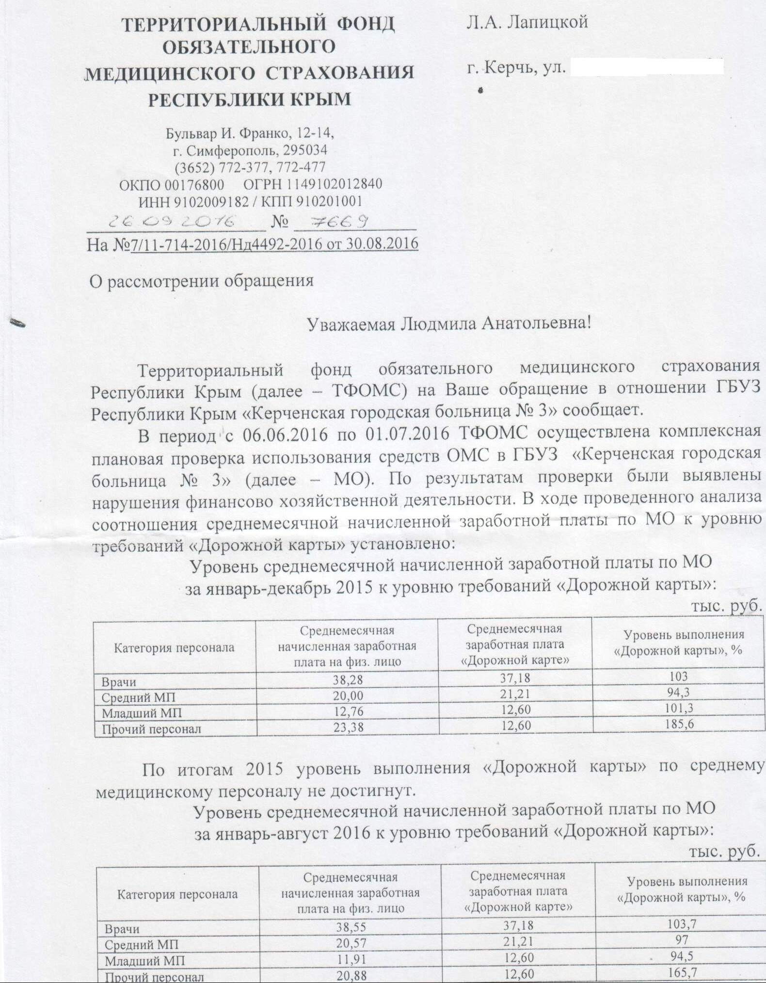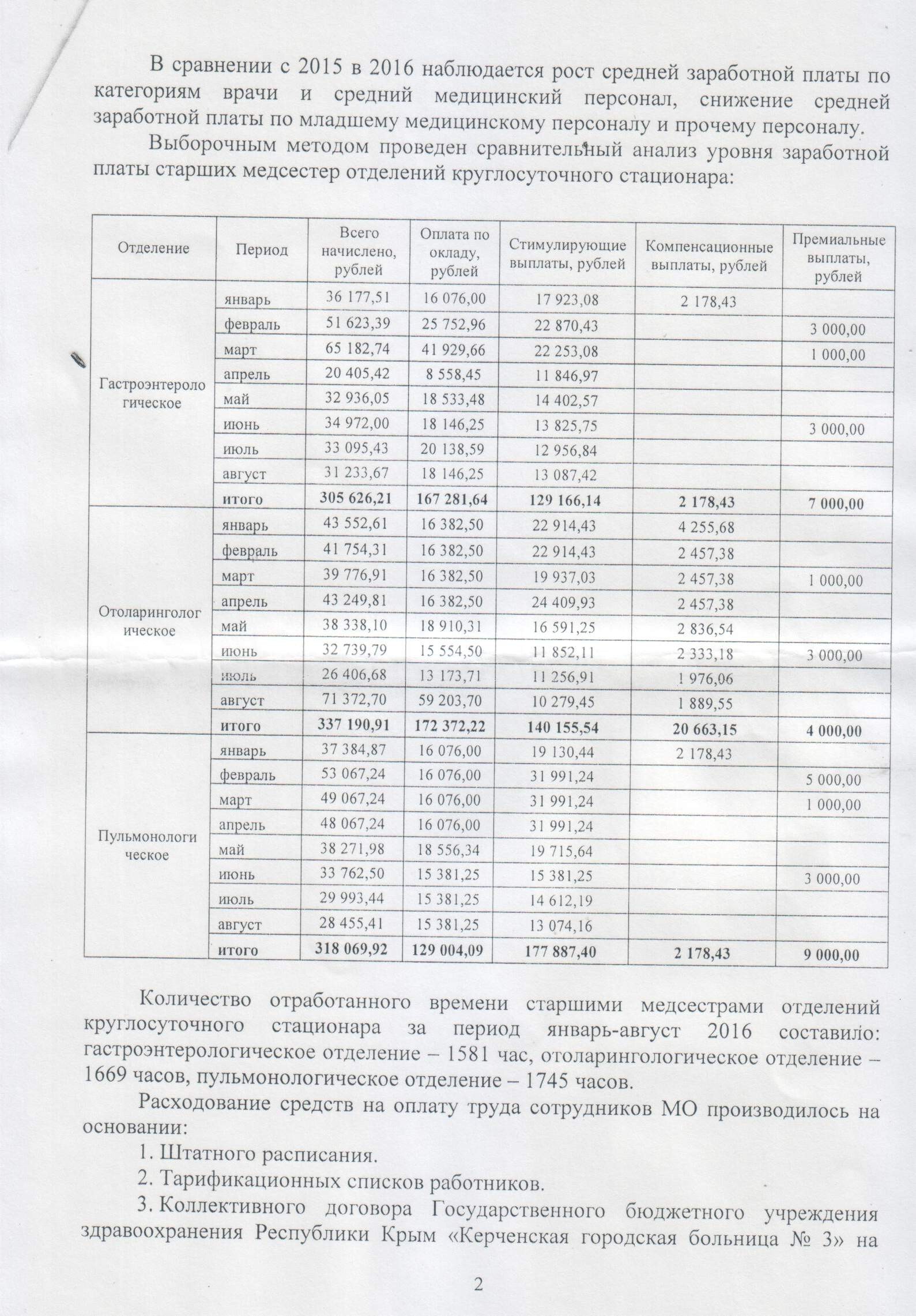 В рамках проведенной проверки территориальным фондом обязательного медицинского страхования были подтверждены факты нарушения финансово-хозяйственной деятельности Керченской больницы №3 и начисления завышенных зарплат, премий и выплат стимулирующего характера административному кадровому составу. В частности, сравнительный анализ уровня заработной платы старшей медсестры ЛОР-отделения Кузнецовой Н.Е. показал среднемесячный уровень зарплаты в размере 42 тыс. рублей при начислении ежемесячных стимулирующих выплат в размере 150%.