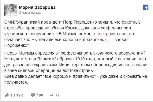 На своей странице в Facebook, дипломат привела цитату из СМИ: "Украинский президент Петр Порошенко заявил, что ракетные стрельбы, прошедшие вблизи Крыма, доказали эффективность украинского вооружения. "В Москве немного понервничали, это означает, что мы делали все хорошо и правильно", - заявил Порошенко".