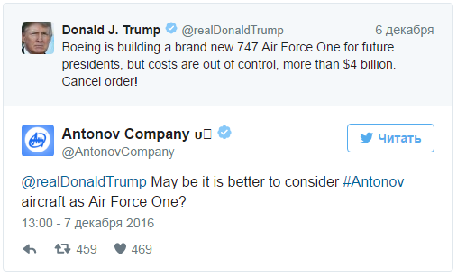 "Может, лучше рассмотреть самолет "Антонов" в качестве борта номер один?", — говорится на странице концерна в Twitter. При этом в "Антонове" не уточнили стоимость их самолета.