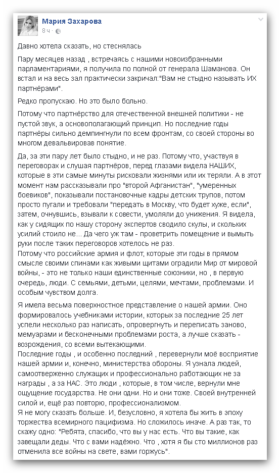 Как написала Захарова на своей странице в Facebook, ей было стыдно слушать заявления «партнеров» в то время, когда российские военные рисковали жизнью.