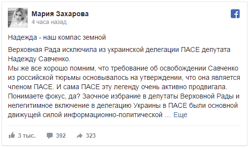 "Понимаете фокус, да? Заочное избрание в депутаты Верховной Рады и нелегитимное включение в делегацию Украины в ПАСЕ были основной движущей силой информационно-политической кампании Киева на тот момент. А когда живая и здоровая Савченко вернулась и по-настоящему начала исполнять свои обязанности, ее исключили", — написала дипломат в своем аккаунте в Facebook.