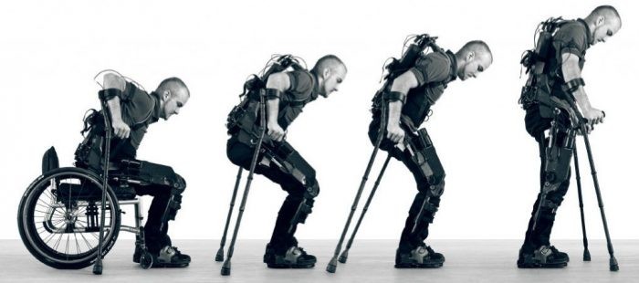 Экзо- (то есть внешний) скелет — по сути стальной позвоночник, который пронизывает пациента с парализацией ног с головы до пят. Функцию спинного мозга выполняет специальный компьютер сзади. А им, свою очередь, управляет либо врач — посредством планшета, либо сам больной — при помощи так называемых «умных» костылей.