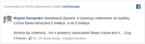 Мария Захарова в своём посте на Facebook опубликовала пост, где принесла извинения за высказывание Главы МИД РФ, но не упустила возможности словесно уколоть оппонента за то, что редакция не удосужилась привести ранние комментарии российского МИДа, а также официально позвонить и узнать мнение касательно атак.