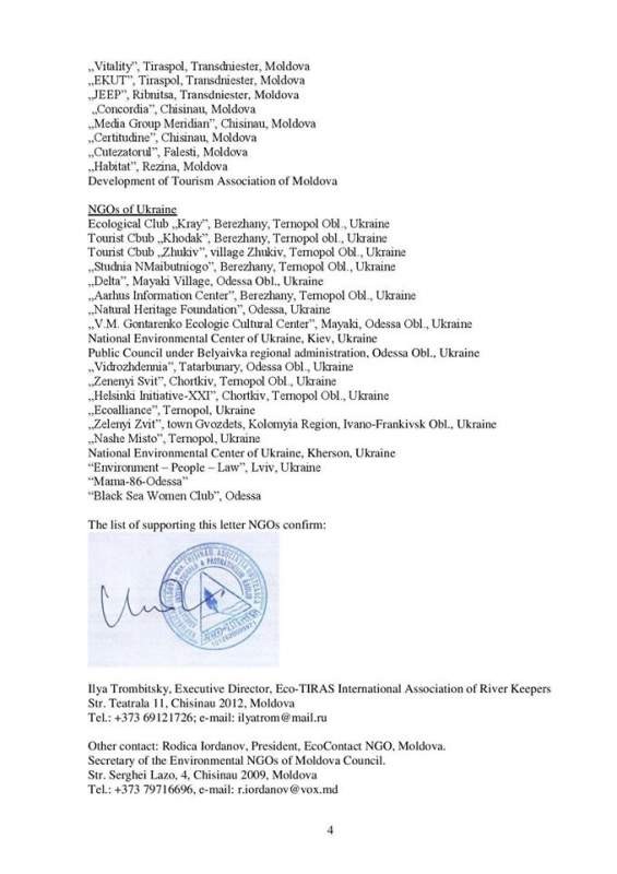 Обращение направлено в 17 международных организаций. «Такое строительство обезводит Днестр и убьет его экосистемы. В конечном счете, подобное инвестиционное решение отдалит обе страны от реализации взятых ими обязательств в связи с подписанием Соглашений об ассоциации с ЕС», - пишет эколог.
