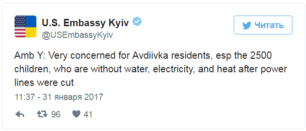 «Очень обеспокоены по поводу жителей Авдеевки, особенно 2500 детей, которые остались без воды, электричества и тепла», – отмечается в сообщении.