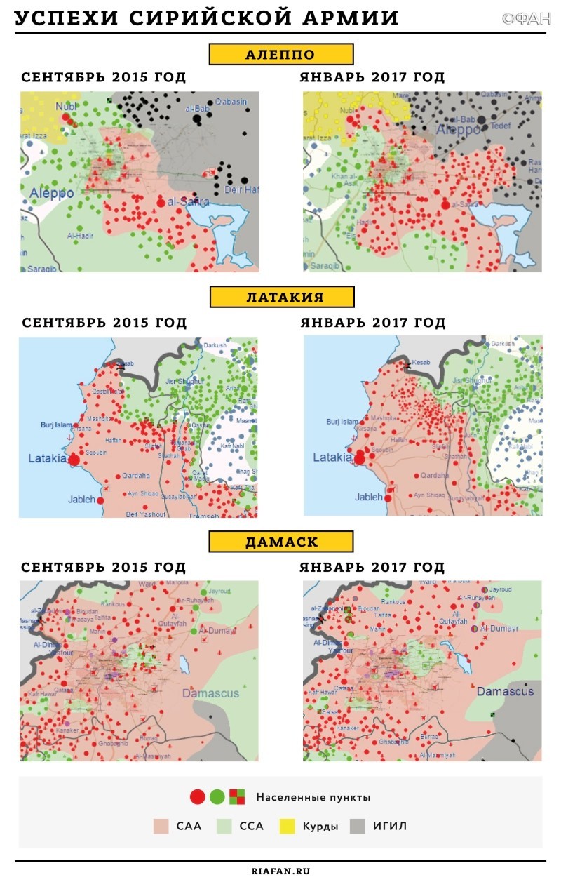 В течение полугода российские военные налаживали взаимодействие с бойцами Асада, попутно осуществляя локальные операции, которые в итоге повернули ситуацию в Сирии вспять. Они привели к стратегическому перелому на фронтах Сирии. Были освобождены Пальмира, крупнейший мегаполис Алеппо и сотни других населенных пунктов. Тысячи боевиков и сотни главарей террористов были ликвидированы. Великолепно спланированные и скоординированные операции позволили сирийцам, наконец, почувствовать вкус победы и обрести надежду на светлое будущее горящей в огне войны страны.