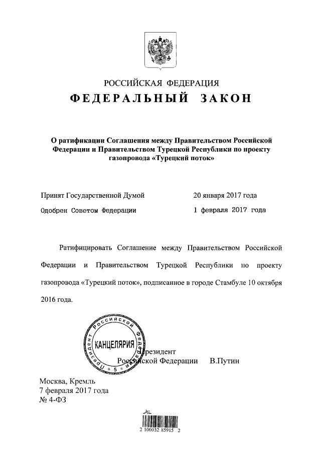 Президент России Владимир Путин подписал закон о ратификации соглашения с Турцией по проекту газопровода "Турецкий поток".