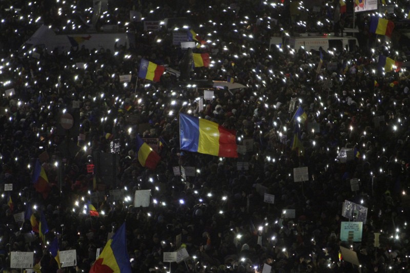 На прошлой неделе в протесте приняло участие около 250 000 человек, что сделало его самым масштабным собранием со времен краха коммунизма в 1989 году. Но в воскресенье толпа выросла вдвое – протесты проходят по всей стране, и сотни тысяч протестующих собрались на площади Победы в Бухаресте.
