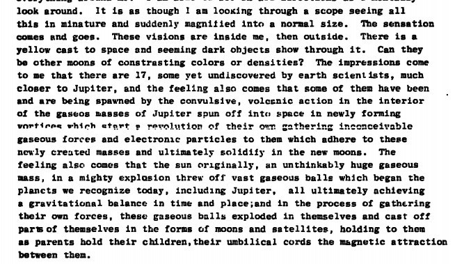 Документ датирован 27 апреля 1973 года. «В пространстве справа от этой комнаты я вижу Юпитер, удалённый на множество миллионов миль. Вижу, как он светится ослепительным светом. Я уверен, что обычное зрение не способно увидеть то, что я наблюдаю внутренним. Я могу смотреть во всех направлениях мысленным взглядом. Сначала я вижу всё в миниатюре, а затем всё увеличивается», — описывает свои ощущения Сванн.