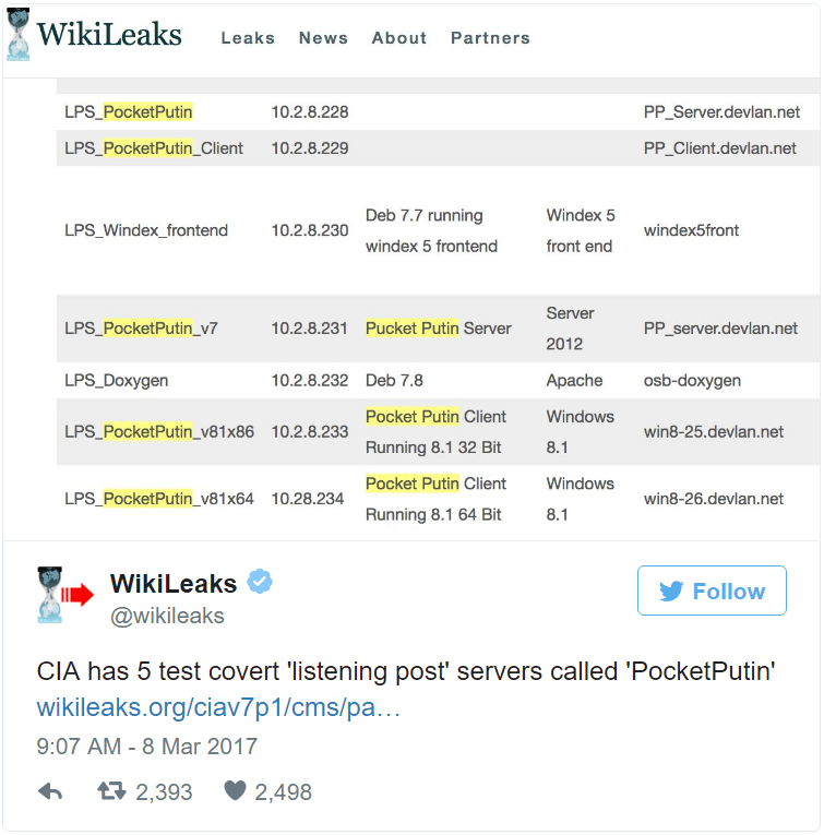 Сайт WikiLeaks в рамках публикации утечек из ЦРУ США представил материал, в котором упомянуты скрытые сервера спецслужб под названием PocketPutin.