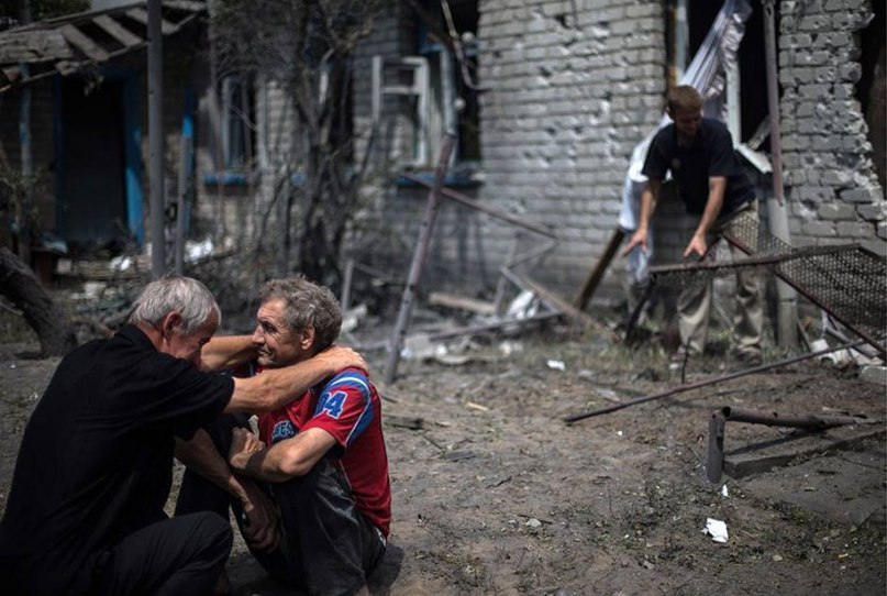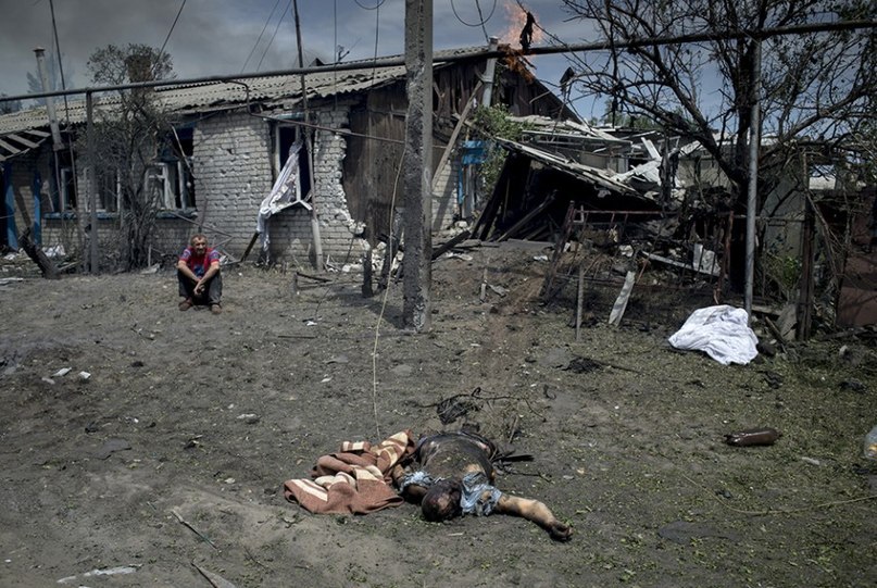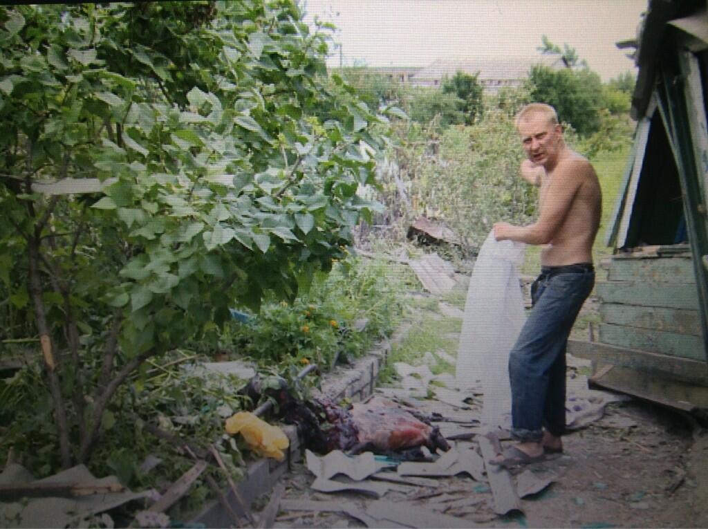 Мы ехали в Кандрашовку (это в 25 км от Луганска), когда некоторые дома еще горели. Сюда угодили по меньшей мере 5 авиабомб, разрушена вся улица, несколько человек убито. Александр приглашает нас в свой двор: "Маму мою убило, разорвало, там еще несколько человек лежат, отец в больнице!. Через улицу еще одна человеческая трагедия. Местные жители рассказывают: - Это тело отца мальчика, вчера его сыну исполнилось 5 лет, а сегодня мальчик с оторванной ногой умер в больнице.