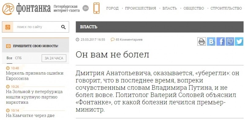 Что имеем в сухом остатке? Заголовок статьи Фонтанки с попыткой пошутить и задать настроение будущему тексту. Вступление с вопросом о самочувствии председателя Правительства, резко перетекающее в интервью с российским националистом, который видит в столь незначительном событии (как плохое самочувствие Медведева) целый государственный заговор. Напоминает уровень расследований телеканала Рен ТВ. О каком доверии к подобным материалам петербургской интернет-газеты может идти речь?