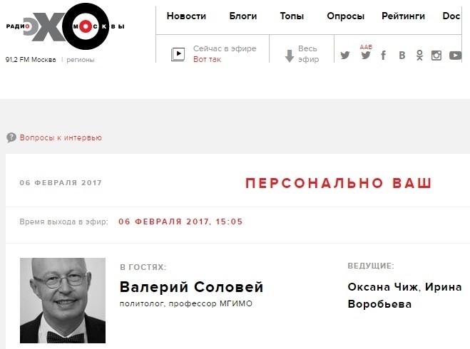 Благо в МГИМО, где он состоит на кафедре связей с общественностью, ему свои идеи продвигать не дают. В остальном Валерий Дмитриевич частый гость в редакциях таких изданий, как Фонтанка, Дождь, Эхо Москвы, Новая Газета или Медуза. Везде он выступает, как непосредственный эксперт по тем или иным вопросам.
