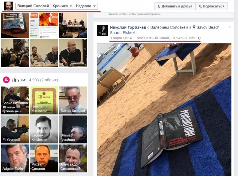 Судя по официальной странице Соловья в фейсбуке – уже не первый год читает собственную книгу о революции, подаренную Навальным, преимущественно думая о судьбе родины — отдыхая на пляжах Египта.