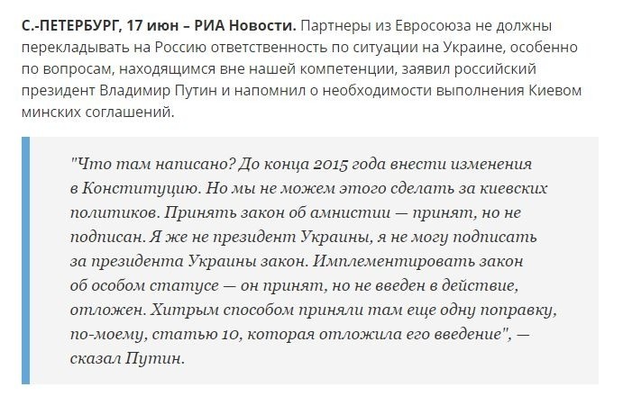 Перекладывать ответственность на РФ за реализацию Минских соглашений Путин также не советует, потому как «эти вопросы находятся вне нашей компетенции». Собственно, рассказывать об «агрессии» России в украинских СМИ – это уже классика, в которую верит разве что сама Украина, УНИАН и прочие масс-медиа.
