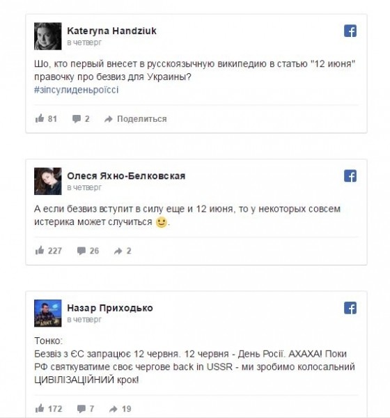 Странно было видеть в статье и то, что русские якобы язвительно отреагировали на получение безвиза Украиной, хотя на самом же деле реакция была вполне адекватной. Нам просто все равно, получили и получили. Молодцы. Скорее сами украинцы иронизировали и высказывались в адрес России нелестно.