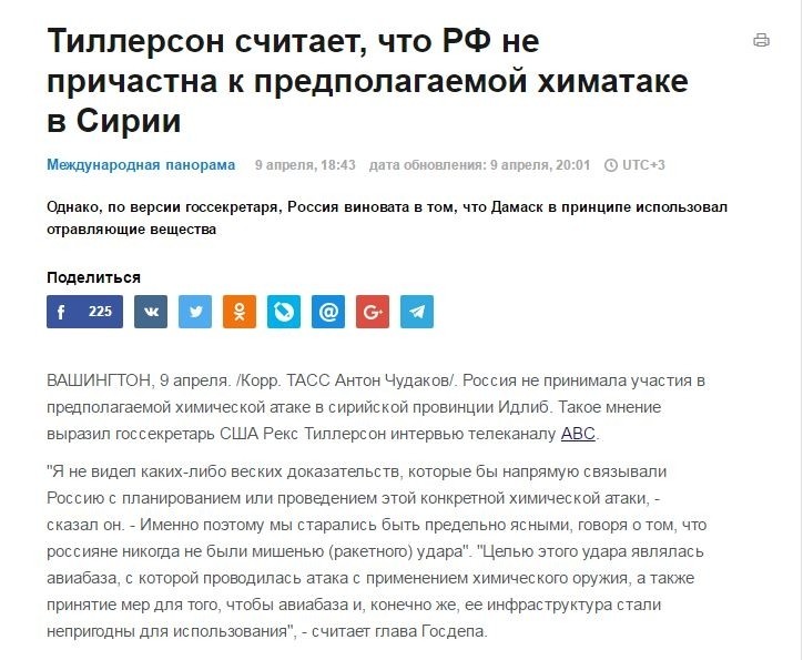 Про трагические события в Сирии УНИАН предпочел также высказаться в антироссийском ключе. Рассуждая о произошедшем, журналисты позволили себе намекнуть на то, что к использованию химоружия причастна Россия. Естественно, никаких пруфов этому не имеется. И, как говорится, по презумпции невиновности нельзя говорить о вине, пока она не доказана. Так что все обвинения УНИАНа – голословны и необоснованны. Да и в США не считают, что Россия причастна к произошедшему. Вот что сказал на этот счет Тиллерсон: