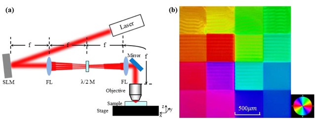a) Установка для записи информации состоит из фемтосекундного лазера, пространственного модулятора света (SLM), линз Фурье (FL), полуволновой фазовой пластинки (λ/2 M), дихроматического зеркала, иммерсионного объектива 1,2 NA, образца кварцевого стекла и платформы. (b) Цветовые коды матрицы с полуволновой фазовой пластинки, впечатанные в кварцевое стекло для контроля поляризации.