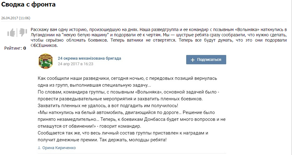 Как оказалось, машину ОБСЕ подорвали разведчики 24-й механизированной отдельной бригады. Пользователи Сети тотчас подхватили «гениальный план» ВСУ и, на голову официального Киева, радость украинского патриотизма уже не остановить.