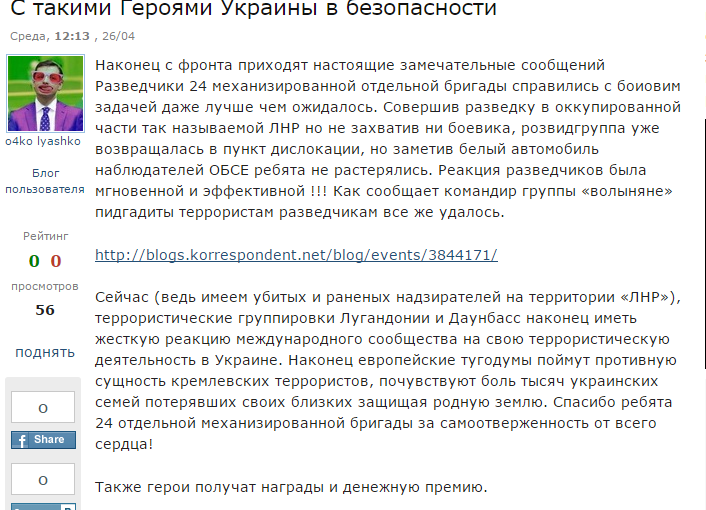 Более того, согласно откровениям все тех же карателей ВСУ личный состав группы диверсантов представлен к наградам и получит денежные вознаграждения. Сообщения, которые стали появляться в социальных сетях после признания ВСУшников, еще раз подтверждают, что подрыв действительно совершили каратели 24-й механизированной отдельной бригады.