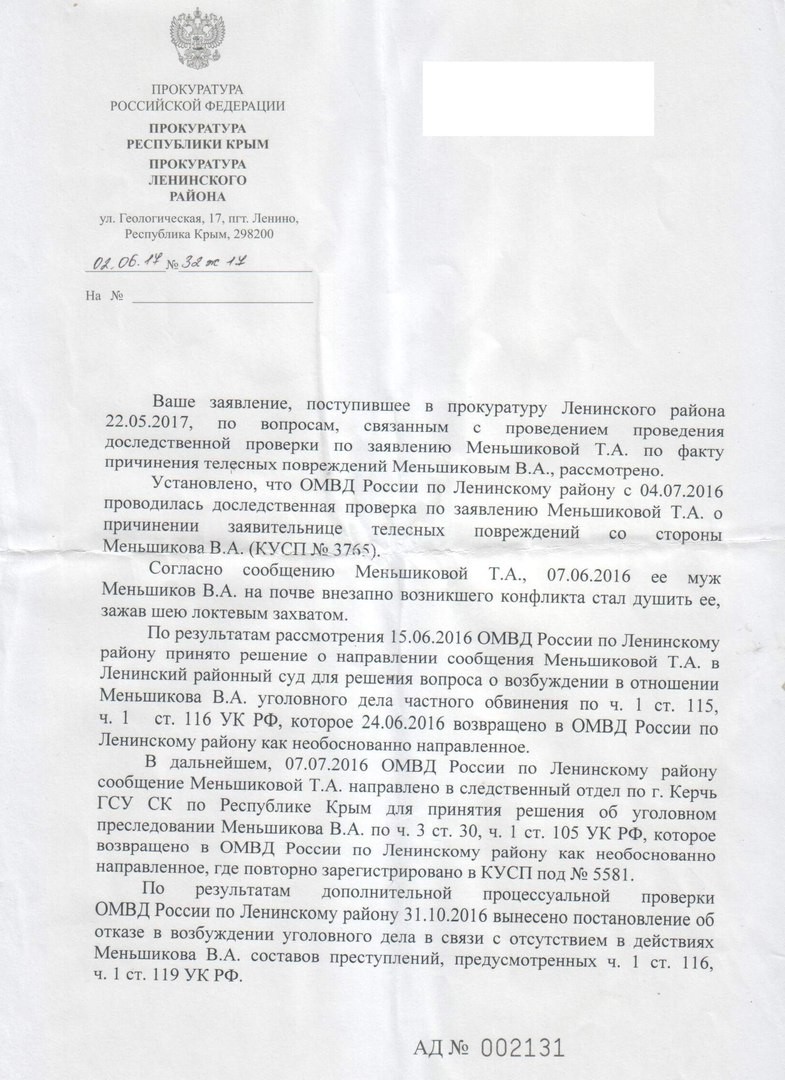 Напомним, ранее сотрудниками ОМВД России по Ленинскому району Республики Крым были установлены обстоятельства совершенного 7 июня 2016 года преступления. Тогда подозреваемый на почве неприязненных отношений совершил покушение на Меньшикову Татьяну Алексеевну. В ходе конфликта он душил и причинил ей телесные повреждения, однако к уголовной ответственности так и не был привлечён.